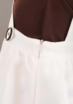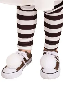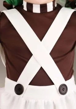 Your toddler will look good enough to eat in her Chocolate Factory Worker costume! This exclusively designed costume includes a lovely brown shirt with striped details and sweet puffed sleeves. A white skirt with crossed suspenders and cute buttons turns a standard uniform into something that looks like a Broadway-worthy outfit. Brown-and-white-striped leggings complement the rest of the ensemble. The crisp white gloves are perfect for stirring pots of butterscotch or taste-testing gummy worms, and the shoe puffs add an extra touch of whimsy.Â
