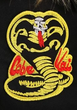 - Headband has embroidered Cobra Kai patch at center; tie as desired