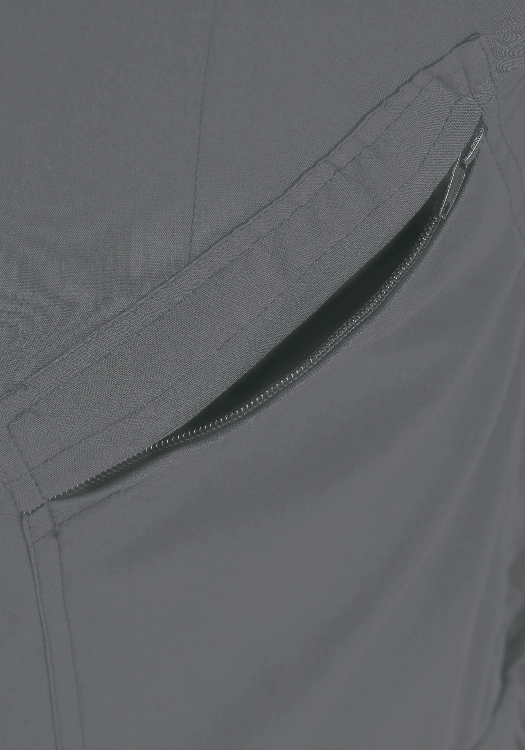 - Jumpsuit has front zipper closure and zippered pockets on front
