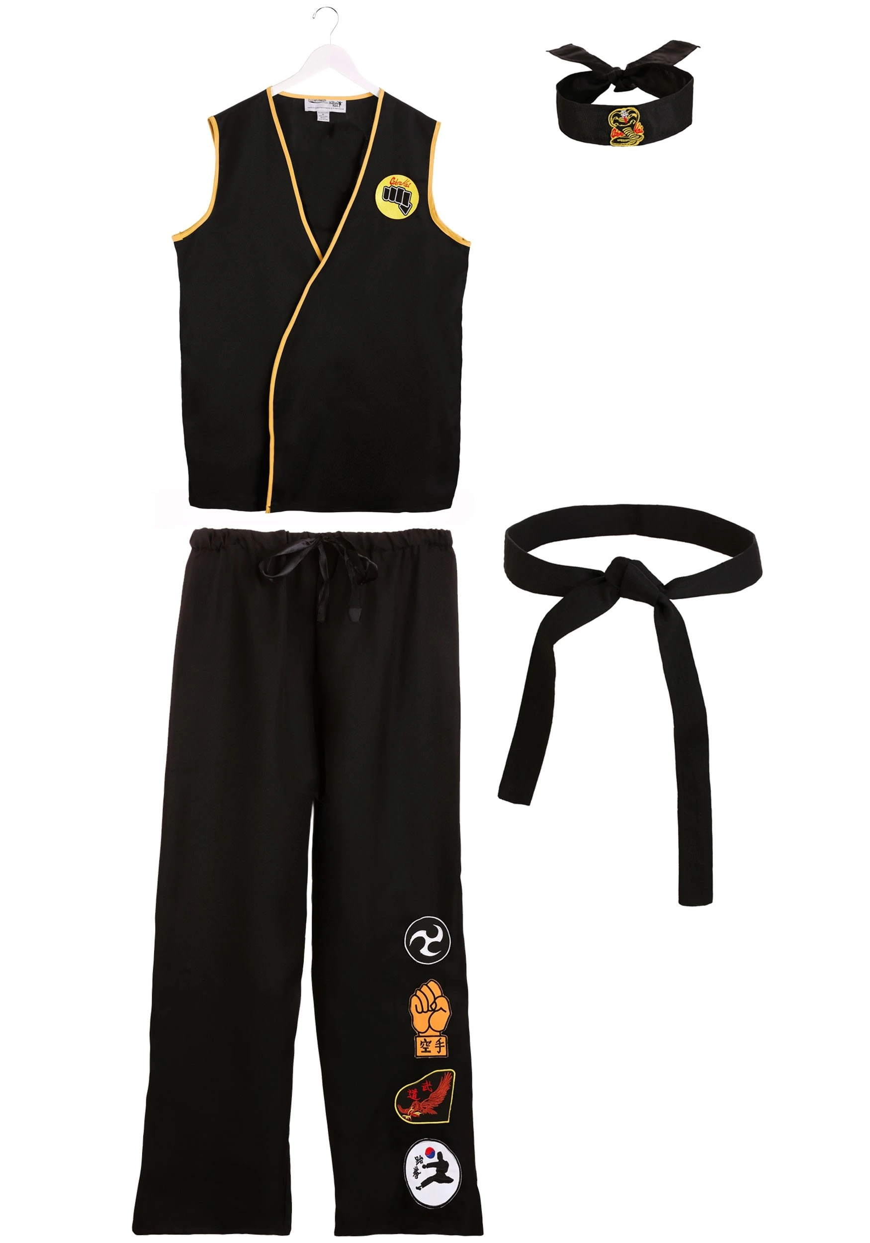 No matter what problems the leader of the Cobra Kai dojo might have, we’re pretty sure that you can turn things around. Start by jumping into this officially licensed costume from Karate Kid. This Cobra Kai look was put together by our in-house design team and ensures you’ll feel like you took a flying kick right out of the 1984 film. Start with your wrap-around shirt that features the dojo’s patches on the front and back. The matching pants have an elastic waist and several patches on the leg to show how successful the dojo has been. Finish off your authentic look with the headband and karate belt and it’ll be your time to shine.