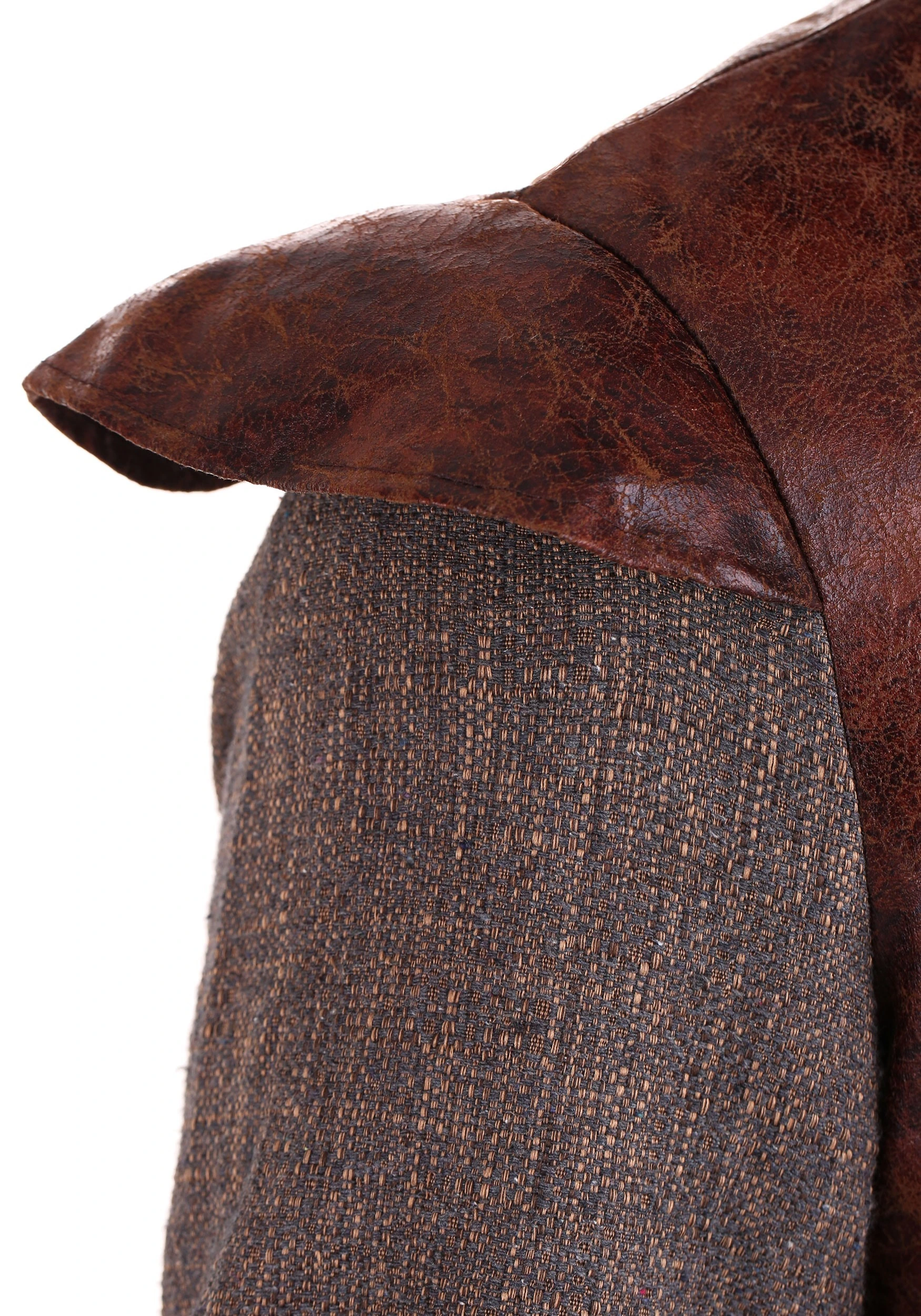 - Tunic body is faux suede & faux leather w/ back zipper, faux linen collar & sleeves