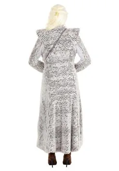 Name yourself our mighty monarch and keep your dragons roaring with pride when you don the royal look with this Winter Dragon Queen costume. Our team of designers worked for the longest summer we’d ever seen to put together this exquisite coat that will last even if the winter never ends. It is a long taupe and white coat of soft, Minky fabric with a tall neck collar and constructed shoulders. The costume is accented by large, ornate silver chains that drape around your shoulder and body with a large metal ring.Â