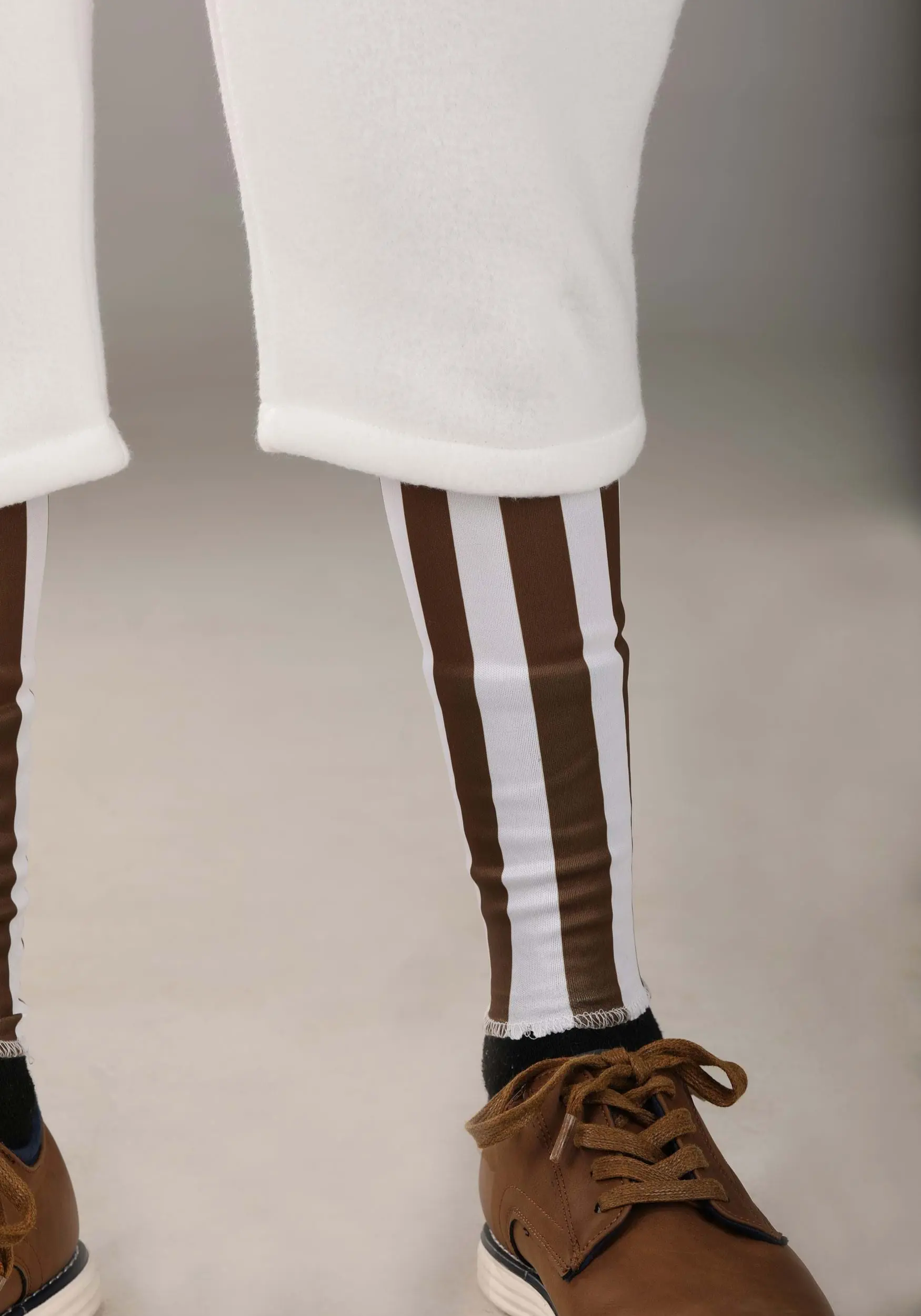 Before punching in for your shift at the chocolate factory (or going trick-or-treating), make sure you put on your officially licensed, exclusive Willy Wonka Oompa Loompa Costume for Kids! The polyester jumpsuit fastens up the back and is designed to look like a chocolate brown shirt underneath a pair of pants with criss-crossed suspenders and buttons. The striped leg warmers match the brown and white trim on the neckline and sleeve cuffs. All you need for a prop is a big bag of candy!Â