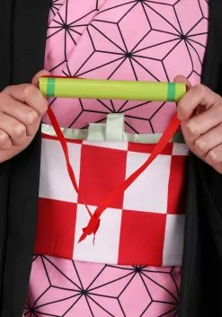 The pink kimono features an all-over geometric print, white edging to give the appearance of a layered ensemble, and a red-and-white checkered sash. A dark brown robe is layered over the pink garment, and with its lightweight materials and flowy sleeves it’s sure to add to the drama of the costume. A narrow green sash with a ribbon tie completes the look.